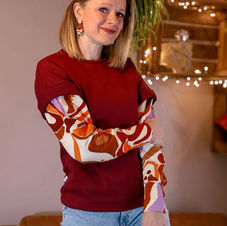Camille est un pull confortable, un peu loose, qui joue avec deux tissus. Une inspiration graphique assumée et une forme inédite.